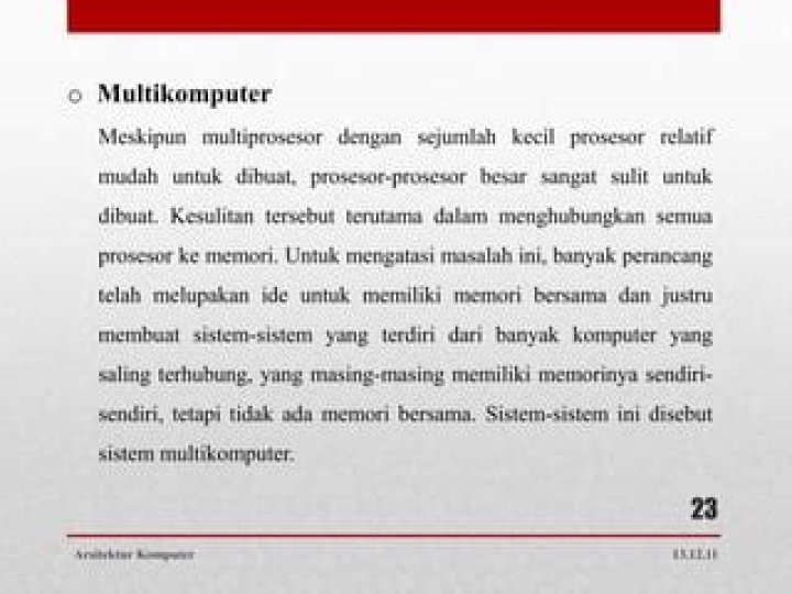 Di sisi lain, pemrograman multicomputer sulit. Multiprocessor adalah sistem dengan dua atau lebih CPU yang memungkinkan pemrosesan program secara simultan. Komputer multikomputer adalah sekumpulan prosesor yang terhubung oleh jaringan komunikasi yang bekerja bersama untuk menyelesaikan masalah komputasi.