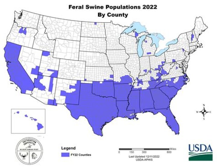 Approximately half of the feral hog population lives in the southern United States. Alabama, Arizona, Arkansas, Florida, Georgia, Louisiana, Mississippi and Oklahoma exhibit a feral hog problem. The worse affected southern state is Texas, where roughly 2 million feral hogs roam.