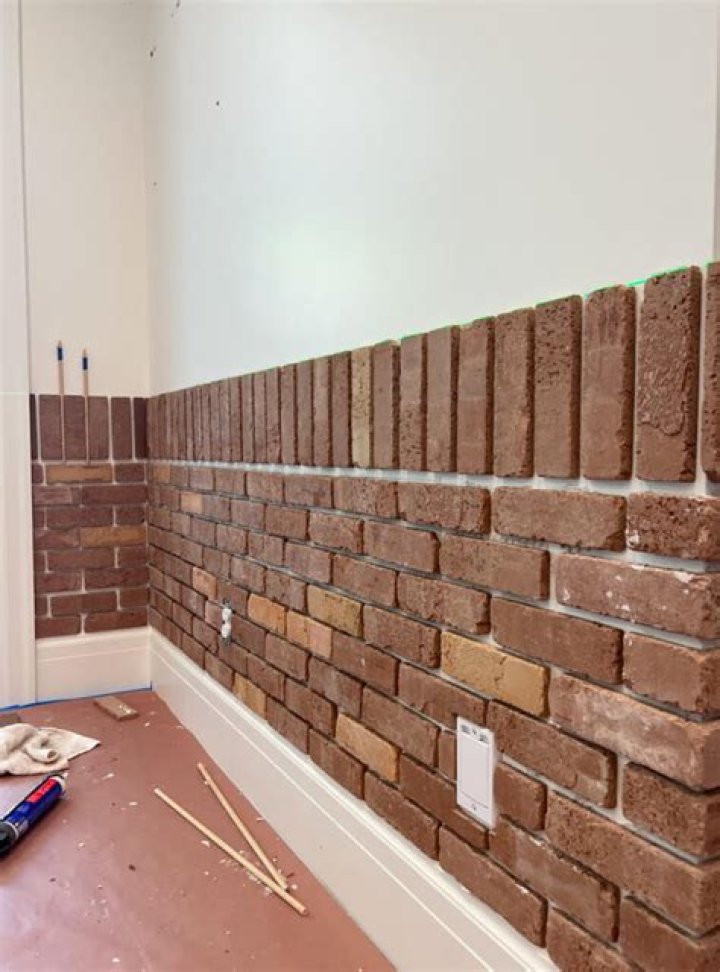Applying thin brick directly over standard drywall may negatively affect joint quality and overall durability. Start with the corner pieces, working either from the top-down, or bottom-up. Using a non-sagging adhesive, apply a generous bead to the back of each brick and firmly press into place on the wall.
