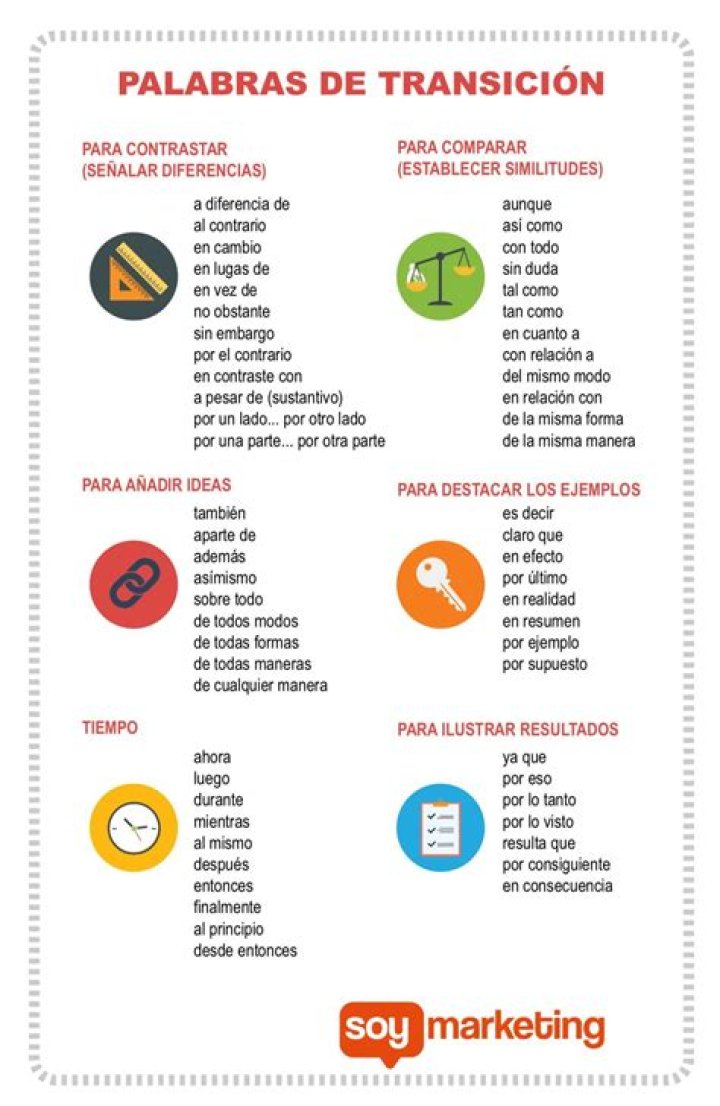 Las palabras o frases de transición son como puentes entre cada una de las partes del escrito. Te ayudan a conectar una oración a otra, una idea con otra, de un párrafo a otro. Finalmente las transiciones unen tus frases y párrafos pausadamente para evitar saltos bruscos o discontinuidad entre las ideas.¿Cómo identificar un párrafo de transicion?