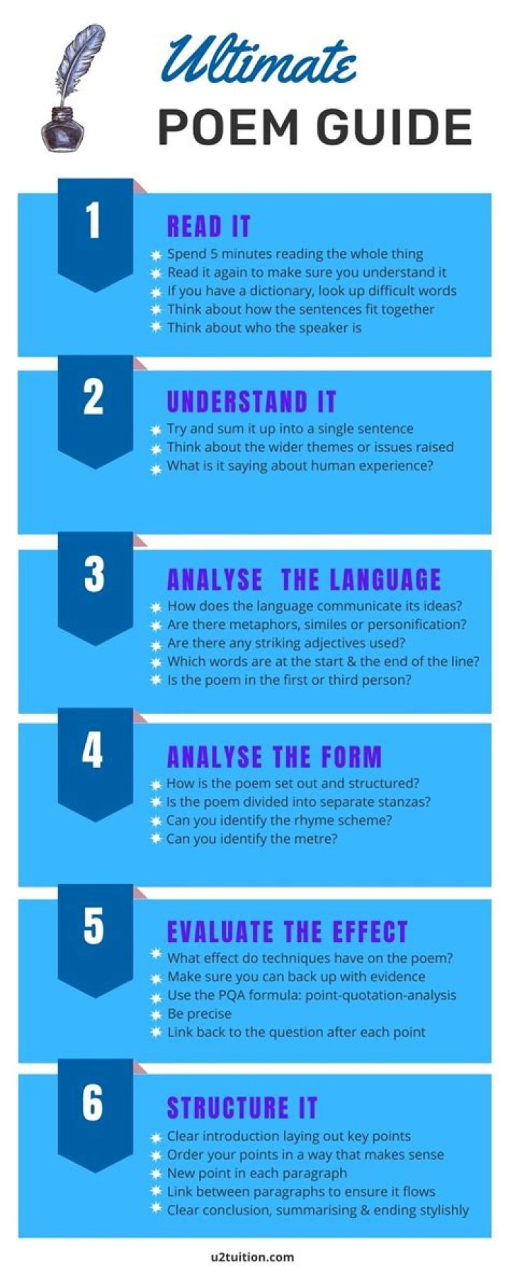 Analysing a poem can be tricky….Here are six steps to help you to analyse a poem: