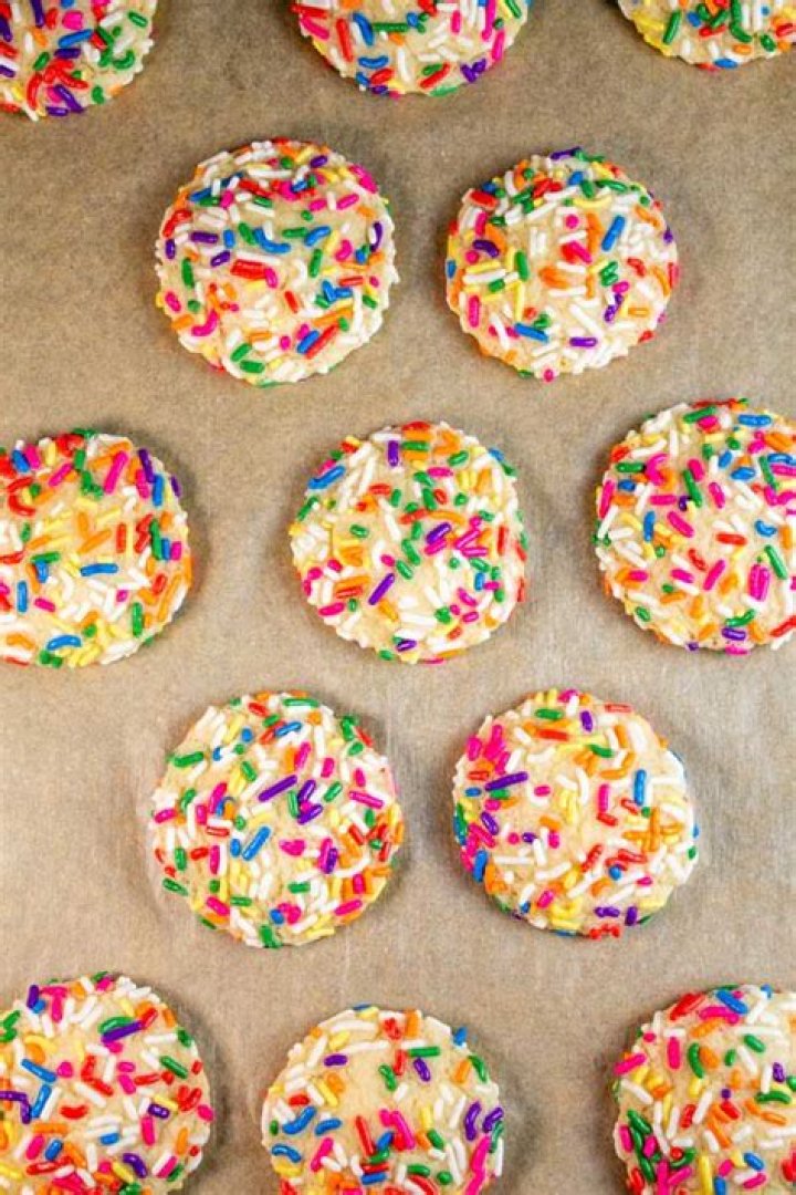 The easiest thing to do is to brush the tops of the cookies with a little bit of water or milk, using just enough to dampen the cookie dough and no more. This will help the sprinkles stick and won’t change the finished appearance of the cookie when you’re done baking.