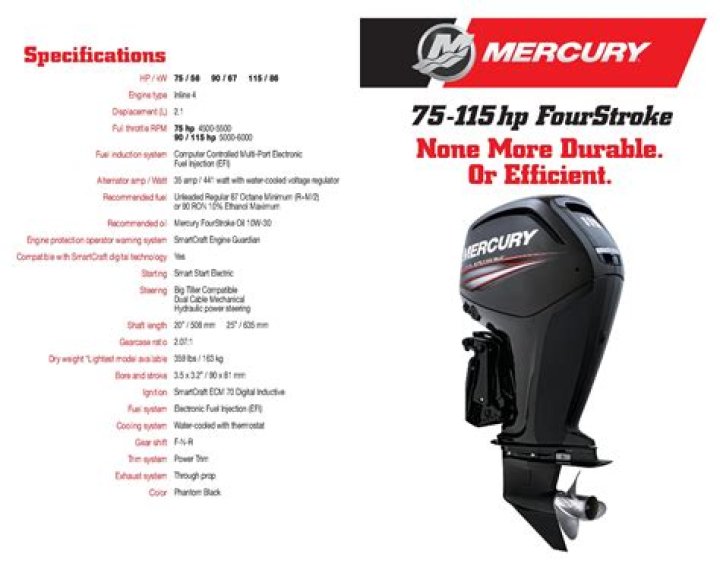 $11,995.00. Brand New 115HP Mercury 4-Stroke EFI CT outboard motor. XL Command Thrust fits both 20″ and 25″ boat and pontoon transoms. Model Includes Electronic Fuel Injection (EFI) plus Power Tilt & Trim.