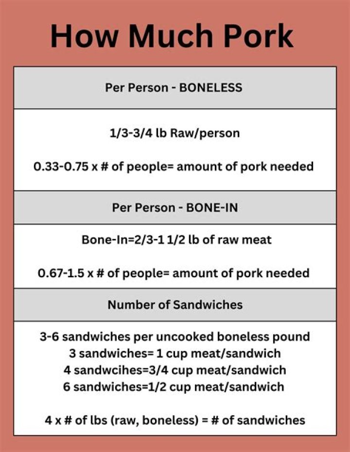 Generally you would allow half a pound per person (225g) of boneless meat or three quarters of a pound (340g) per person of bone in meat.