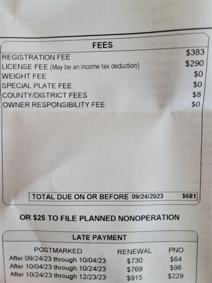 How much are the penalties for late payment? There is a $5 penalty on the registration fee and a 10% penalty of the ad valorem tax, if applicable.