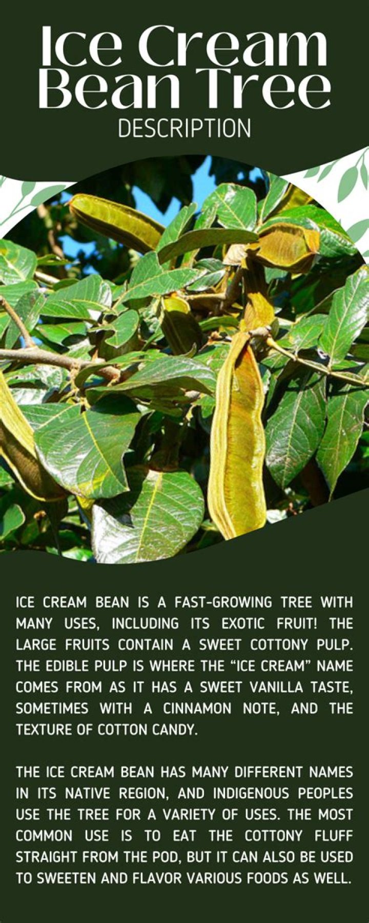 The large fruits contain a sweet cottony pulp. The edible pulp is where the “ice cream” name comes from as it has a sweet vanilla taste, sometimes with a cinnamon note, and the texture of cotton candy. The ice cream bean has many different names in its native region, and indigenous peoples use the tree for a variety of uses.