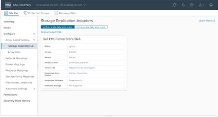 - In the Site Pair tab, go to Configure > Array Based Replication > Storage Replication Adapters , and click the Rescan Adapters button.