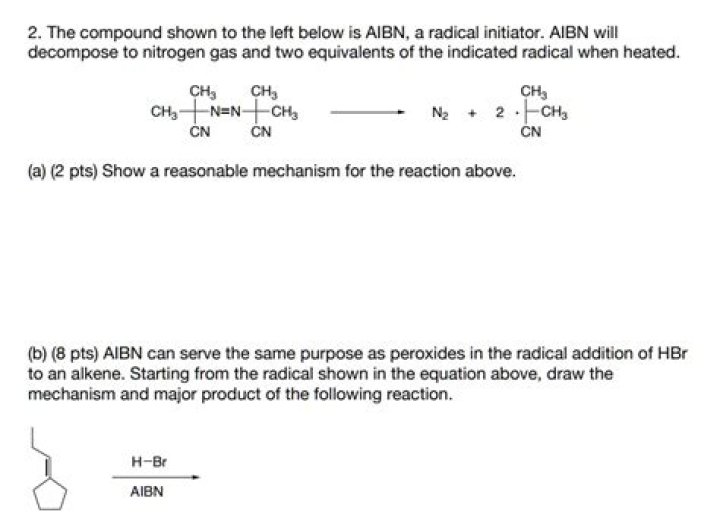 2. Example of a radical reaction that can be initiated by AIBN is the anti-Markovnikov hydrohalogenation of alkenes. AIBN is safer to use than benzoyl peroxide (another radical initiator) because the risk of explosion is far less.