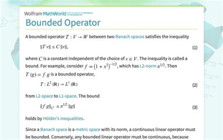 In functional analysis and related areas of mathematics, a continuous linear operator or continuous linear mapping is a continuous linear transformation between topological vector spaces. An operator between two normed spaces is a bounded linear operator if and only if it is a continuous linear operator.