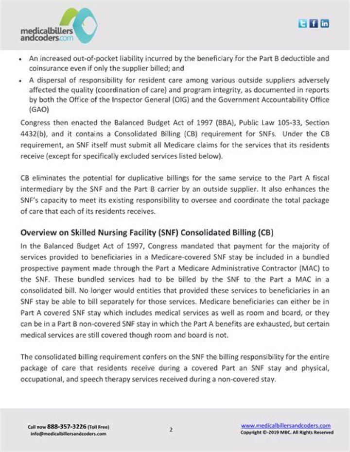Consolidated billing includes physical, occupational, therapies and speech-language pathology services received for any patient that resides in a SNF. Therefore the SNF must work with suppliers, physicians and other practitioners.