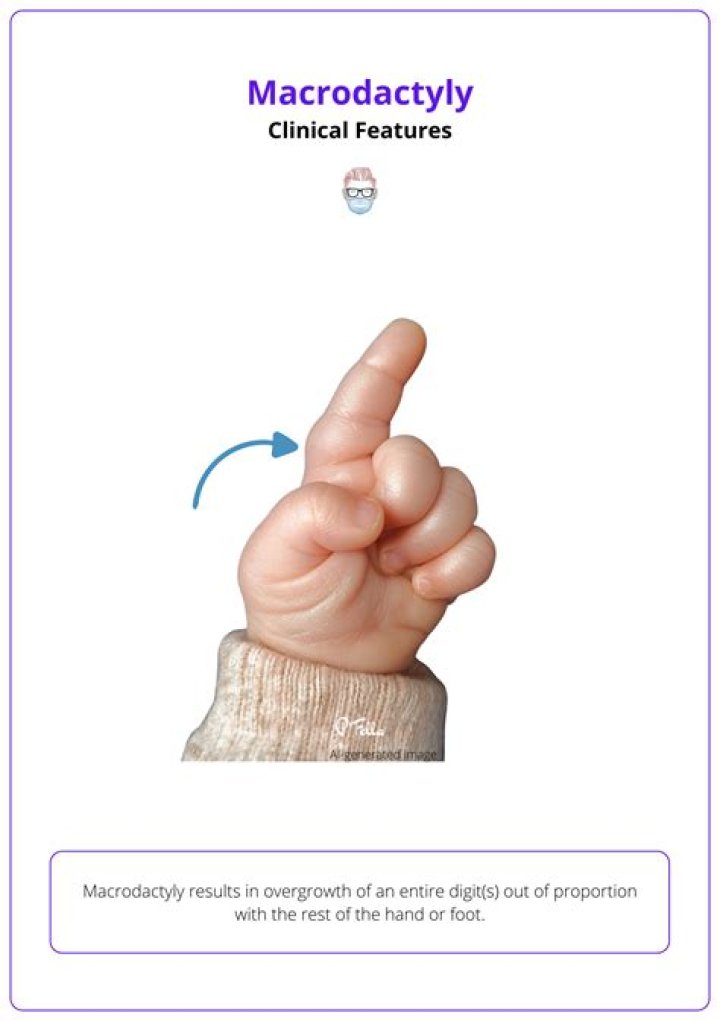 A child’s hand with large fingers present in macrodactyly Macrodactyly is a congenital condition in which a baby is born with abnormally large fingers or toes due to an overgrowth of the underlying bones and soft tissue. Macrodactyly occurs more often in hands than the feet.