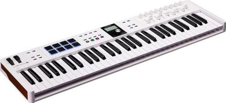 The white Arturia KeyLab 88 Essential is a universal MIDI controller and software package that features 88 semi-weighted, velocity-sensitive keys, a clickable encoder, nine additional encoders, nine sliders, eight touch and pressure sensitive pads, six transport control switches, four command switches, a modulation …
