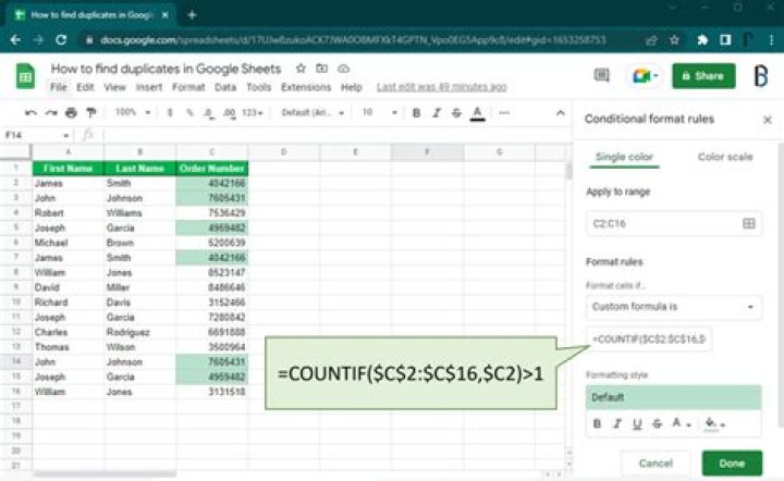 Set “Format cells if…” to “Custom formula is” and enter the duplicate check formula “=countif(Range,Criteria)>1” and hit “Done” to return a “true/false” response. In the case of our example, we’re using the formula “=countif($A$2:$A$15,A2)>1” to check for duplicates.