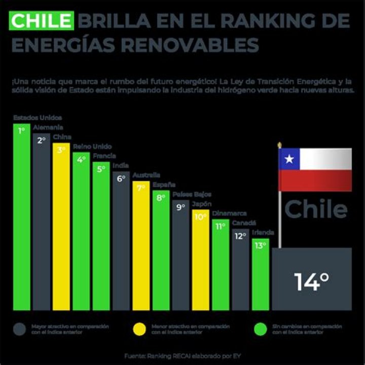 Chile ha confirmado su liderazgo en materia de energías renovables. Chile tiene la radiación solar más alta del mundo, fuertes vientos de norte a sur para desarrollar energía eólica, un tremendo potencial de energía marina en las costas, gran capacidad para desarrollar biogás y un recurso geotérmico a lo largo de la cordillera de Los Andes.