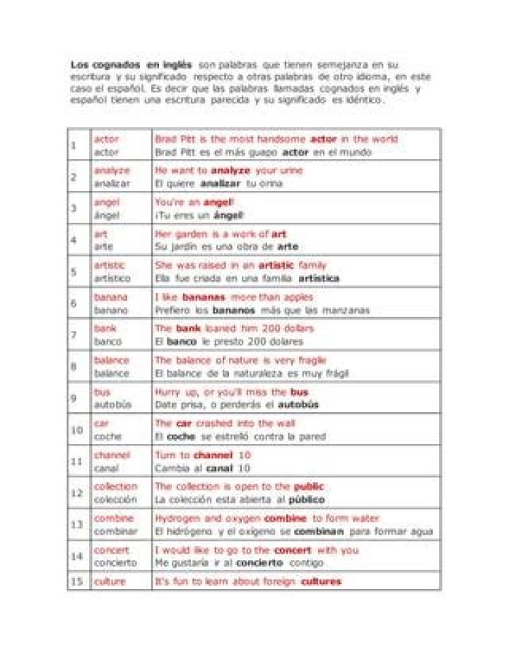 Son palabras que en inglés y español se parecen y significan lo mismo; pueden ser exactamente iguales o tener diferencia en alguna letra o vocal como león/ lion, número/number, moderno/ modern; mientras que los falsos cognados son palabras similares en forma, pero con significado distinto en uno y otro idioma, con …
