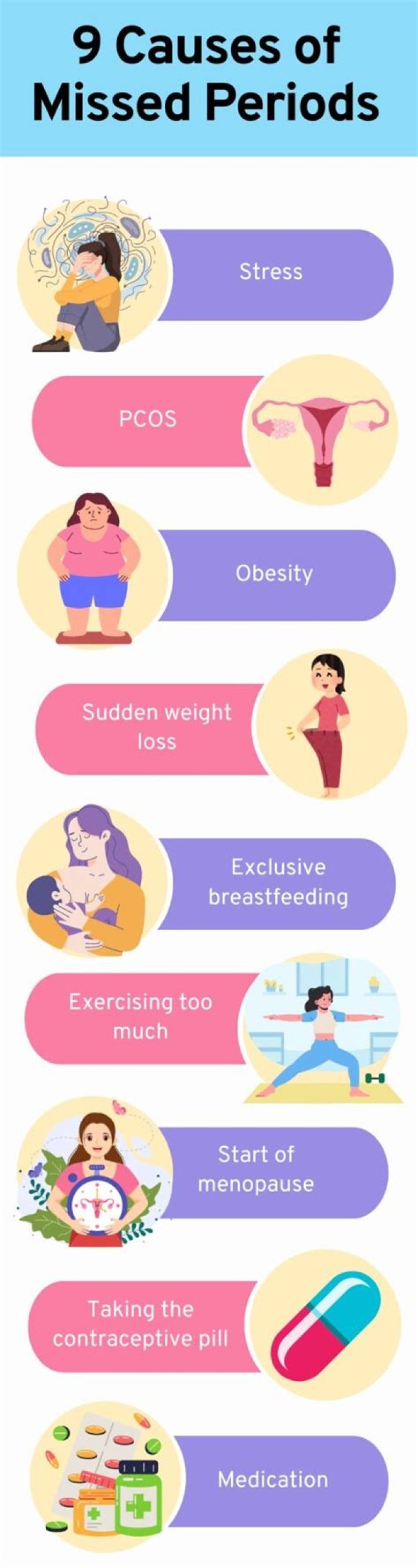 Your cycle Missed or late periods happen for many reasons other than pregnancy. Common causes can range from hormonal imbalances to serious medical conditions. There are also two times in a woman’s life when it’s totally normal for her period to be irregular: when it first begins, and when menopause starts.