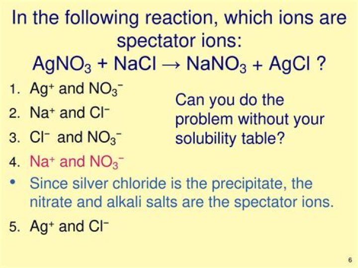 When aqueous solutions of NaCl and AgNO3 are combined there are actually four different ions moving around in the water. They are Na+, Cl-, Ag+ and NO3 – ions. They are called spectator ions because they are present but only “watching” as the precipitate forms.