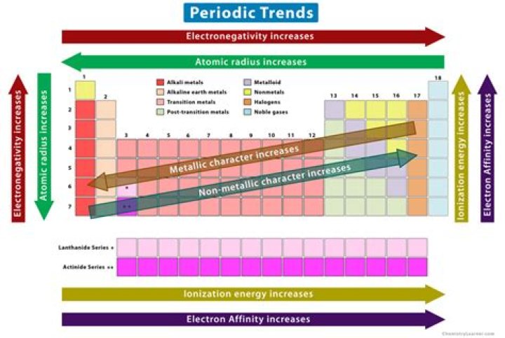 Major periodic trends include:electronegativity, ionization energy, electron affinity, atomic radius, melting point, andmetallic character. Periodic trends, arising from the arrangement of the periodic table, provide chemists with an invaluable tool to quickly predict an element’s properties.