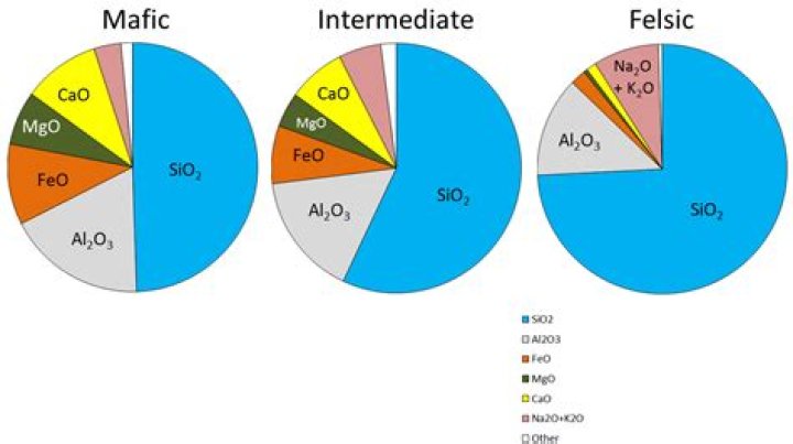 In a widely accepted silica-content classification scheme, rocks with more than 65 percent silica are called felsic; those with between 55 and 65 percent silica are intermediate; those with between 45 and 55 percent silica are mafic; and those with less than 45 percent are ultramafic.