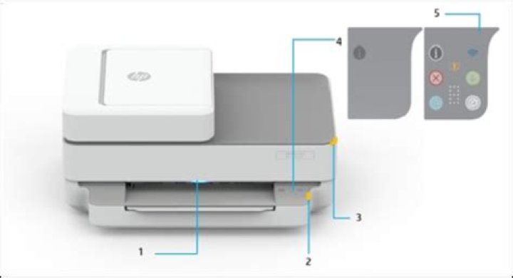 Power button: Press this button to turn the printer on or off. 2. Control panel display: Indicates number of copies, paper errors, wireless status and signal strength, Wi-Fi Direct status, and ink levels. 3. Ink Alert light: Indicates low ink or ink cartridge problems.
