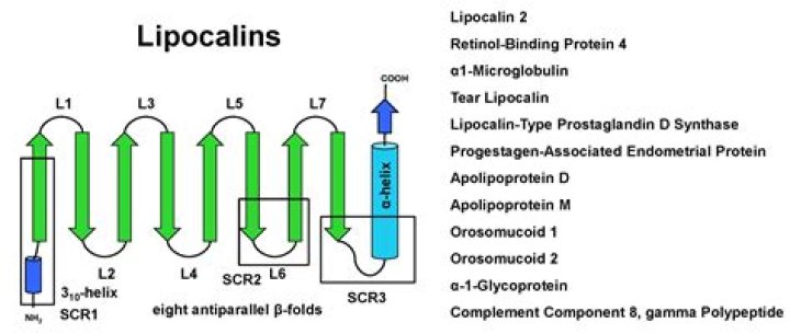 Lipocalins are a family of proteins that transport small hydrophobic molecules such as steroids, bilins, retinoids, and lipids that share limited regions of sequence homology and a common tertiary structure of an eight stranded antiparallel beta-barrel enclosing in internal ligand binding.