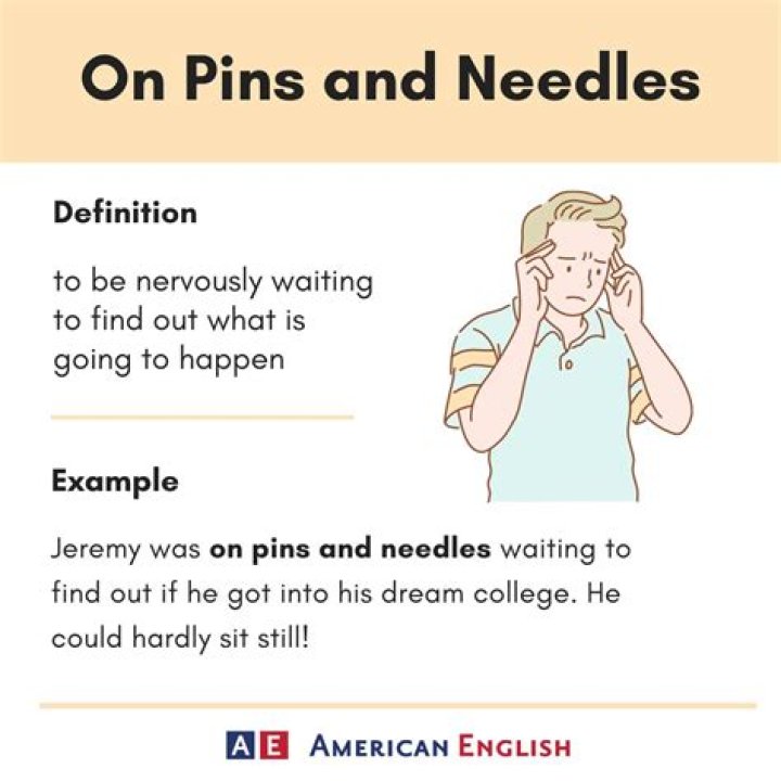 On Pins and Needles. When you use the expression ‘On Pins and Needles’ you mean that someone is in a. state of anxious suspense . Example of use: “Todd has been on pins and needles all day, waiting for his wife to have the baby.”. The origin of the phrase ‘on pins and needles’ comes from the early 19th century.
