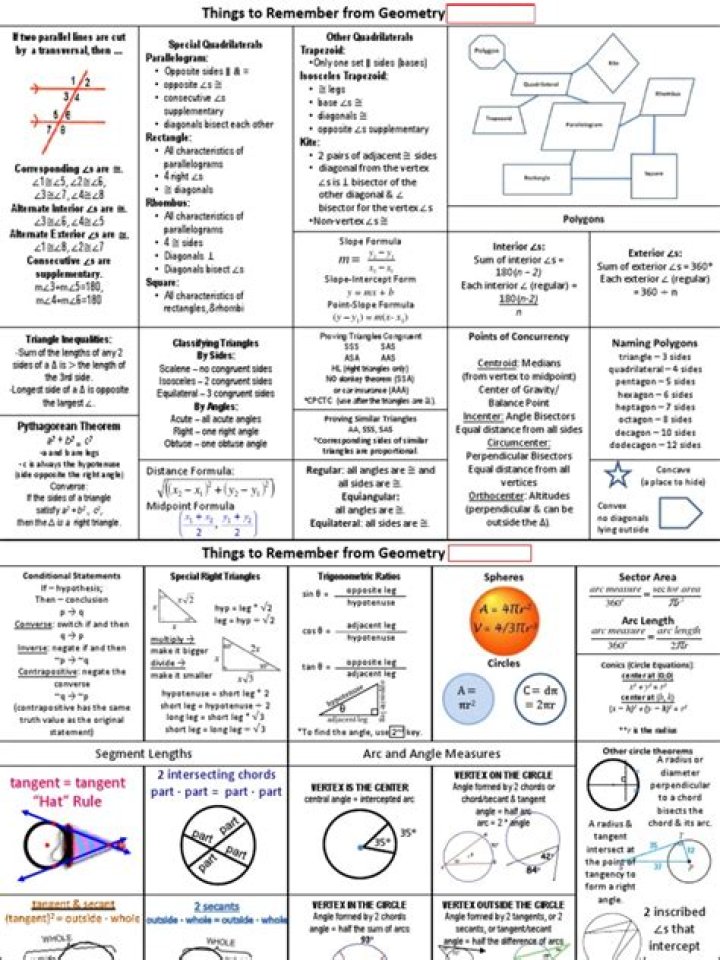 Topics of study include points, lines, and angles; triangles; right triangles; quadrilaterals and other polygons; circles; coordinate geometry; three-dimensional solids; geometric constructions; symmetry; the use of transformations; and non-Euclidean geometries.