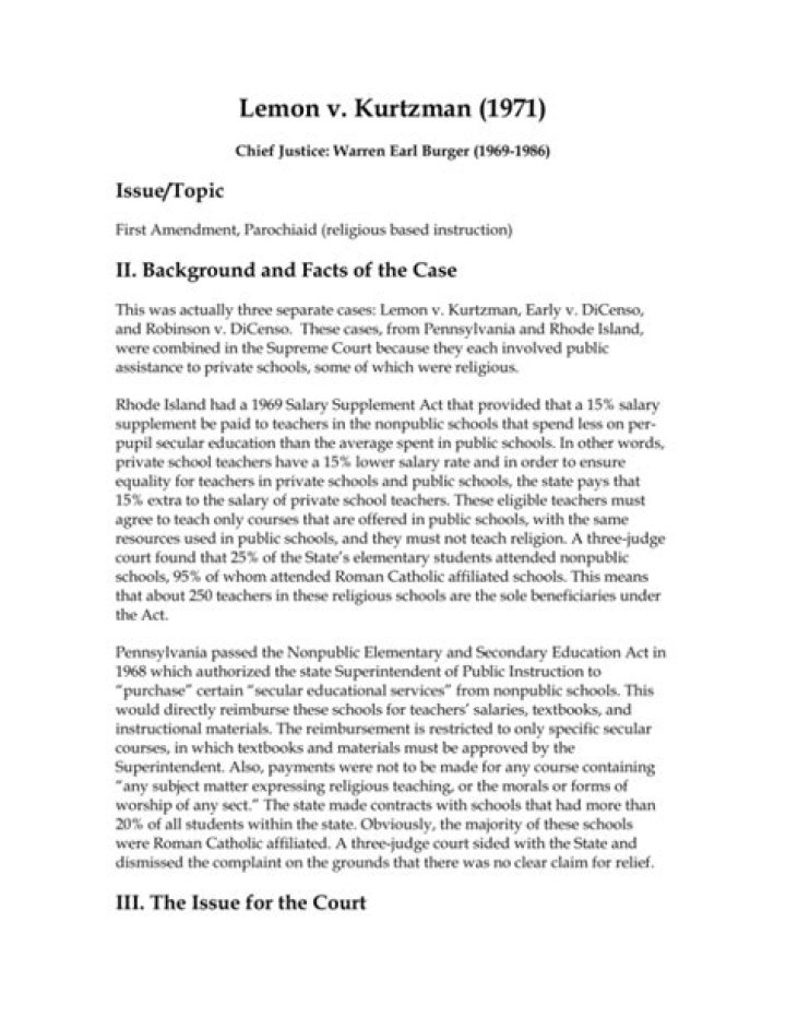 By Richard L. Pacelle Jr. The Lemon test, while it has been criticized and modified through the years, remains the main test used by lower courts in establishment clause cases, such as those involving government aid to parochial schools or the introduction of religious observances into the public sector.Which civil liberty did the case Lemon v Kurtzman address?
