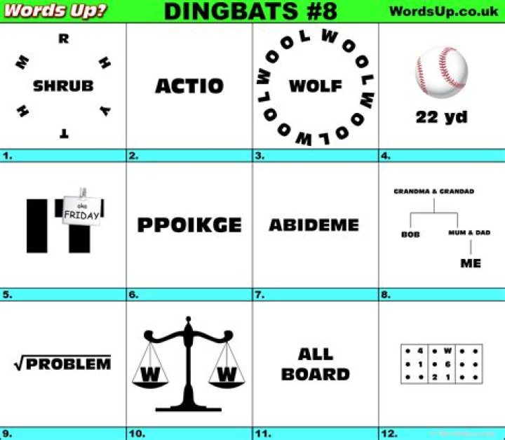 There are over 710 dingbats, and each dingbat game has been given a difficulty rating and although they don’t come with answers , you can log in and access a series of clues that will lead you to the answer. If you are looking for dingbats with answers then you might be interested in our Dingbats Book.