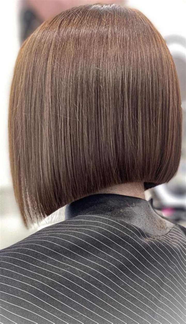 THE HAIRCUT. This cut is a modern bob shape, creating length that sits just above the shoulders. A soft, side fringe was added to open up the face and play up the eyes and eyebrows. The cut is a bold, but still timeless women’s hairstyle.