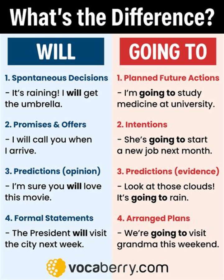 | Will + infinitive | Be going to + infinitive |