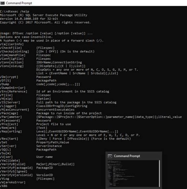 To install the 32-bit version of the dtexec utility, you must select either Client Tools or SQL Server Data Tools (SSDT) during setup. By default, a 64-bit computer that has both the 64-bit and 32-bit versions of an Integration Services command prompt utility installed will run the 32-bit version at the command prompt.