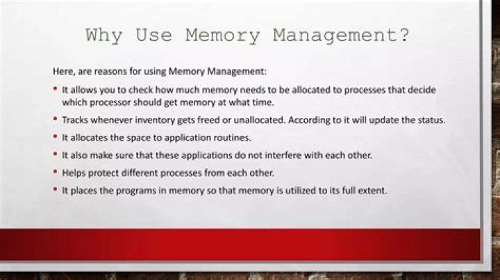 Memory management is the functionality of an operating system which handles or manages primary memory and moves processes back and forth between main memory and disk during execution. It checks how much memory is to be allocated to processes. It decides which process will get memory at what time.