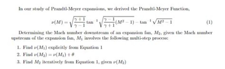 In aerodynamics, the Prandtl–Meyer function describes the angle through which a flow turns isentropically from sonic velocity (M=1) to a Mach (M) number greater than 1. The maximum angle through which a sonic (M = 1) flow can be turned around a convex corner is calculated for M = .