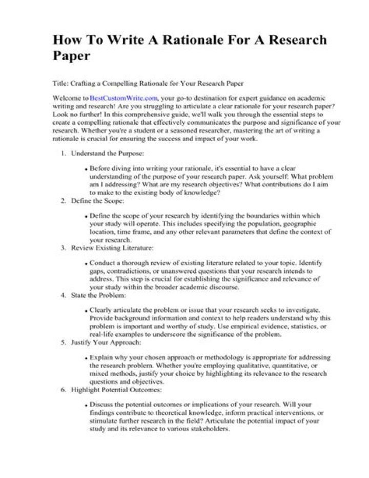 A rationale is a set of reasons or logical basis that explains to your reader why your research question. or study is needed to contribute to the relevant field of study.