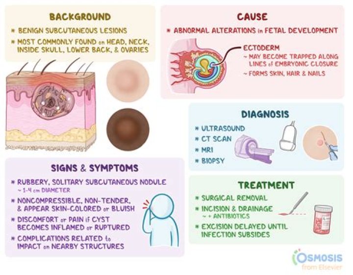 A dermoid cyst is present from birth. It happens when the skin layers don’t grow together as they should. This happens during a baby’s development in the uterus. They are often found on the head, neck, or face. But they can occur anywhere on the body.