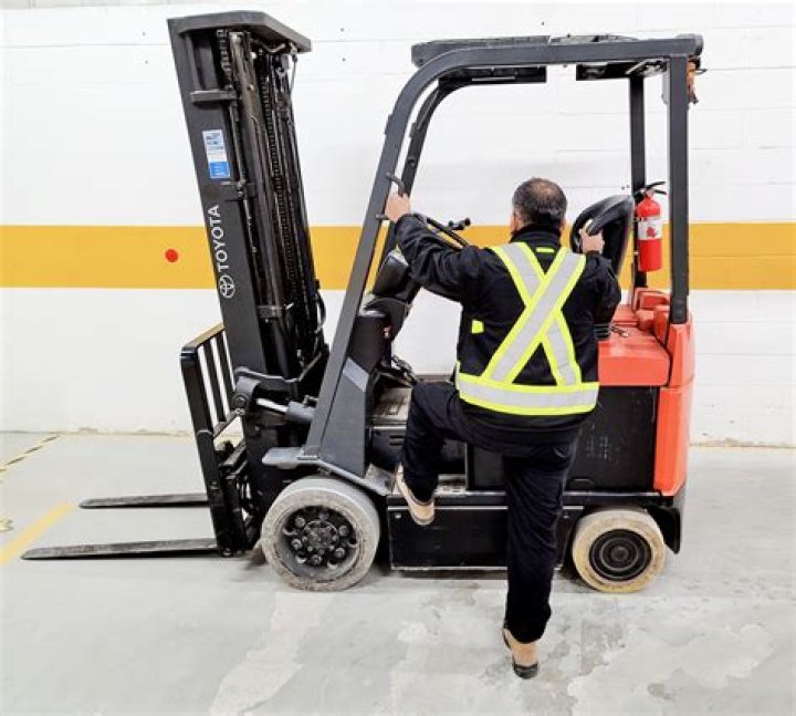 Face the forklift and maintain three points of contact (hands and feet) when you get on and off. Minimise the number of times you need to get on and off.