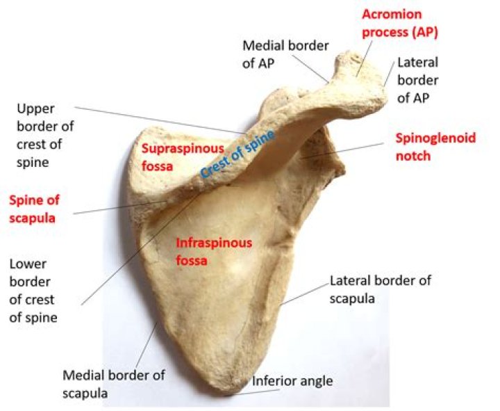 Superior Angle – At the superior end of the scapula, a small triangular projection is formed at the junction of the superior border and medial border, called the superior angle, which allows fibers from the levator scapulae to attach. It will be easy to locate these three borders if you remember your directional terms: