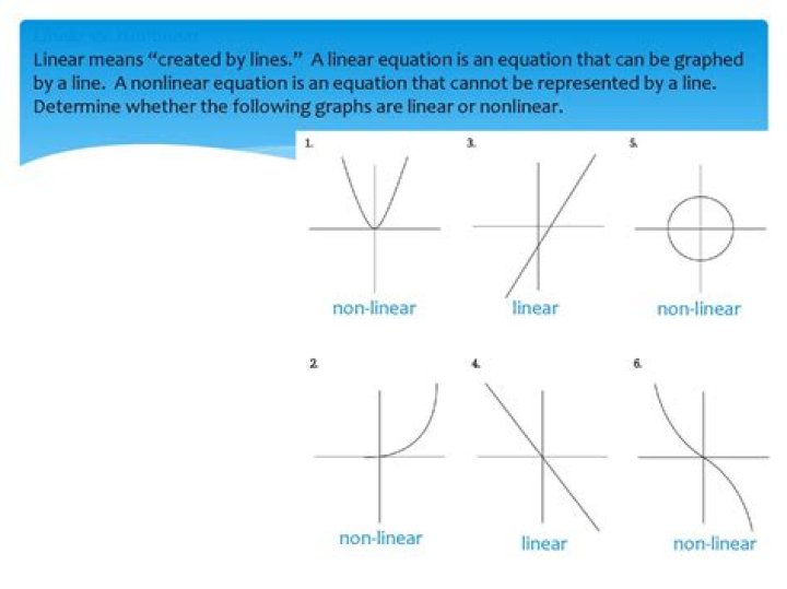 Non-Linear Equations. A non-linear equation look like a curve when graphed. It has a variable slope value. The degree of a non-linear equation is at least 2 or other higher integer values. With the increase in the degree of the equation, the curvature of the graph increases.
