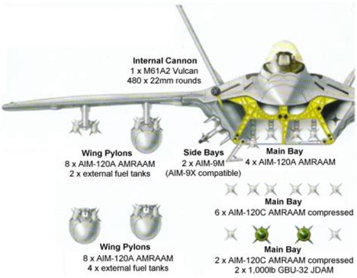 For its primary air-to-air role, the F-22 will carry six AIM-120C and two AIM-9 missiles. For its air-to-ground role, the F-22 can internally carry two 1,000 pound-class Joint Direct Attack Munitions (JDAM), two AIM-120C, and two AIM-9 missiles.