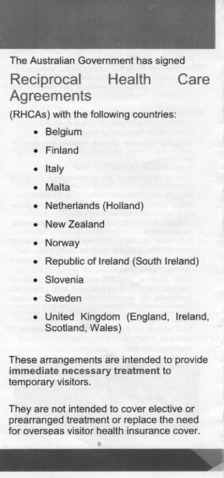 A Reciprocal Health Care Agreement enables visitors from certain countries to get essential medical treatment while they’re in Australia. The Australian Government has Reciprocal Health Care Agreements (RHCA) with 11 countries.