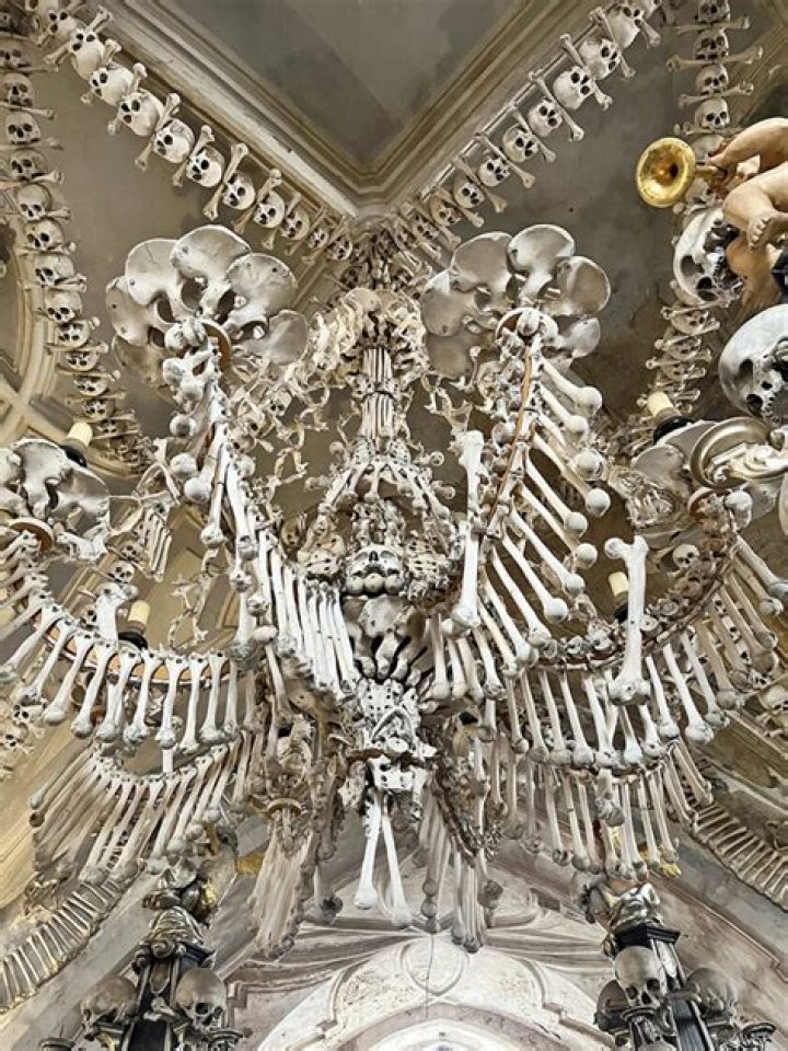 The result is spectacularly shocking. This underground chapel contains a chandelier made entirely of bones, as well as garlands of human skulls. To the left of the chandelier, sits a coat of arms formed of the bones of the Schwarzenbergs, an aristocratic Czech family who once ruled over the city.
