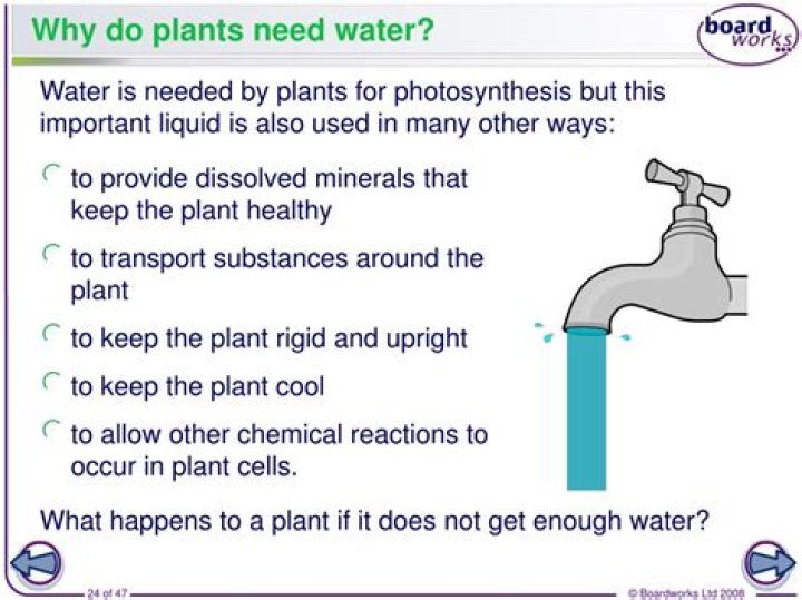 Plants need water for photosynthesis. Water also helps move nutrients from the soil into the plant. Too little water can cause a plant to wilt or droop. Too much water can cause a plant’s roots to rot.